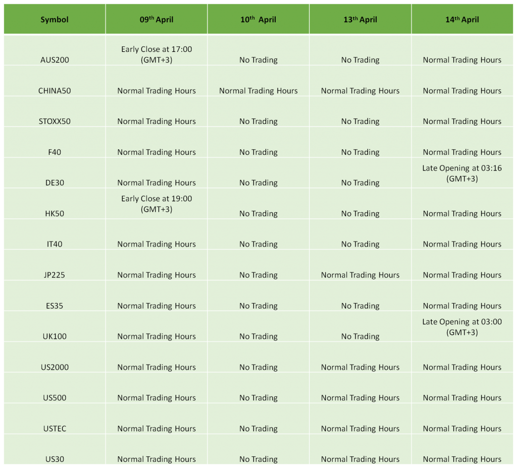 Please find our Updated trading schedule and general information for the Easter Holidays starting Friday, 10th April 2020 below. All times mentioned below are Platform time (GMT +3).