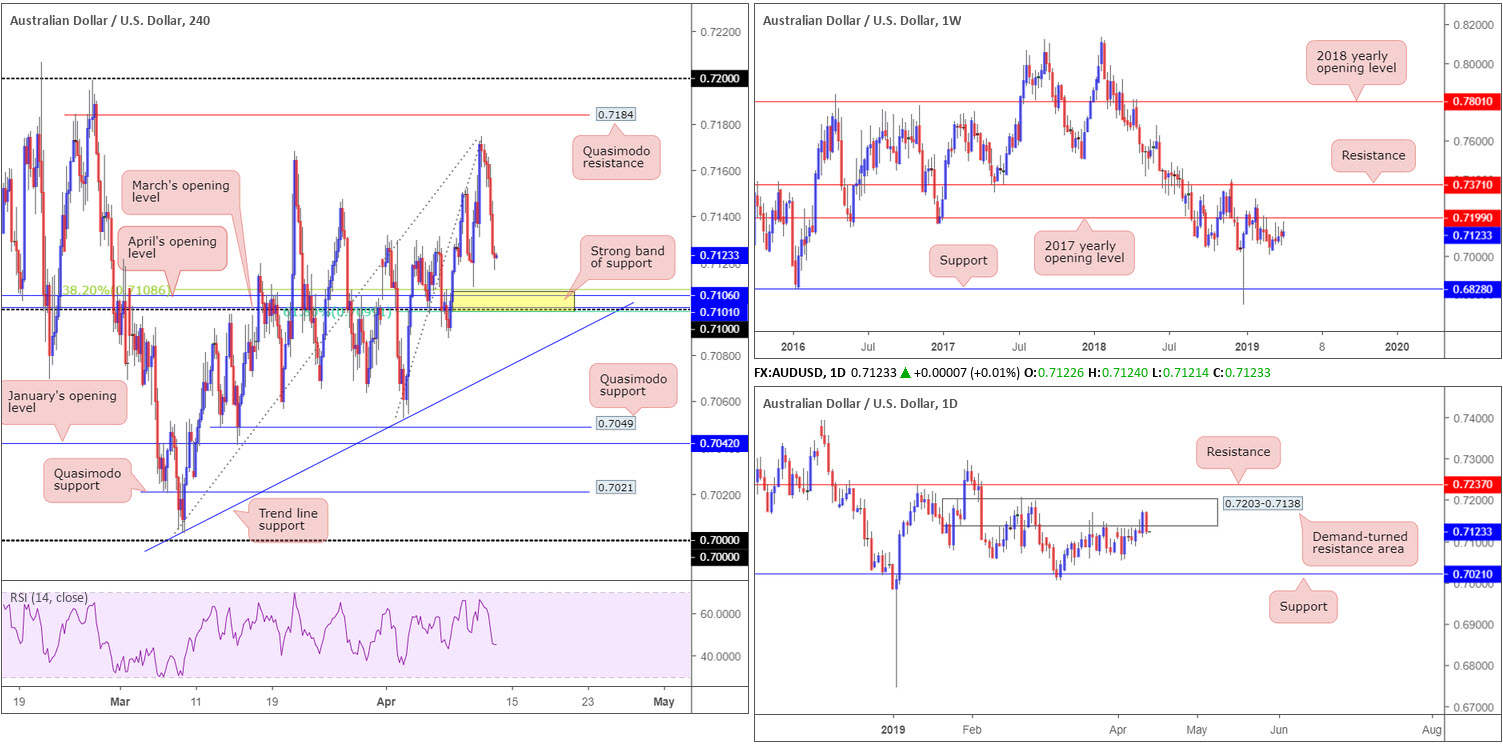Leaving H4 Quasimodo resistance at 0.7184 unopposed, the AUD/USD declined 0.64% on the day, eroding a large portion of Wednesday’s gains. Consequent to this, the H4 candles are positioned ahead of a particularly interesting band of support covering 0.7099/0.7108 (yellow – comprised of a 61.8% Fibonacci support value at 0.7099, a 0.71 round number, March’s opening level at 0.7101, April’s opening level at 0.7106 and a 38.2% Fibonacci support at 0.7108).