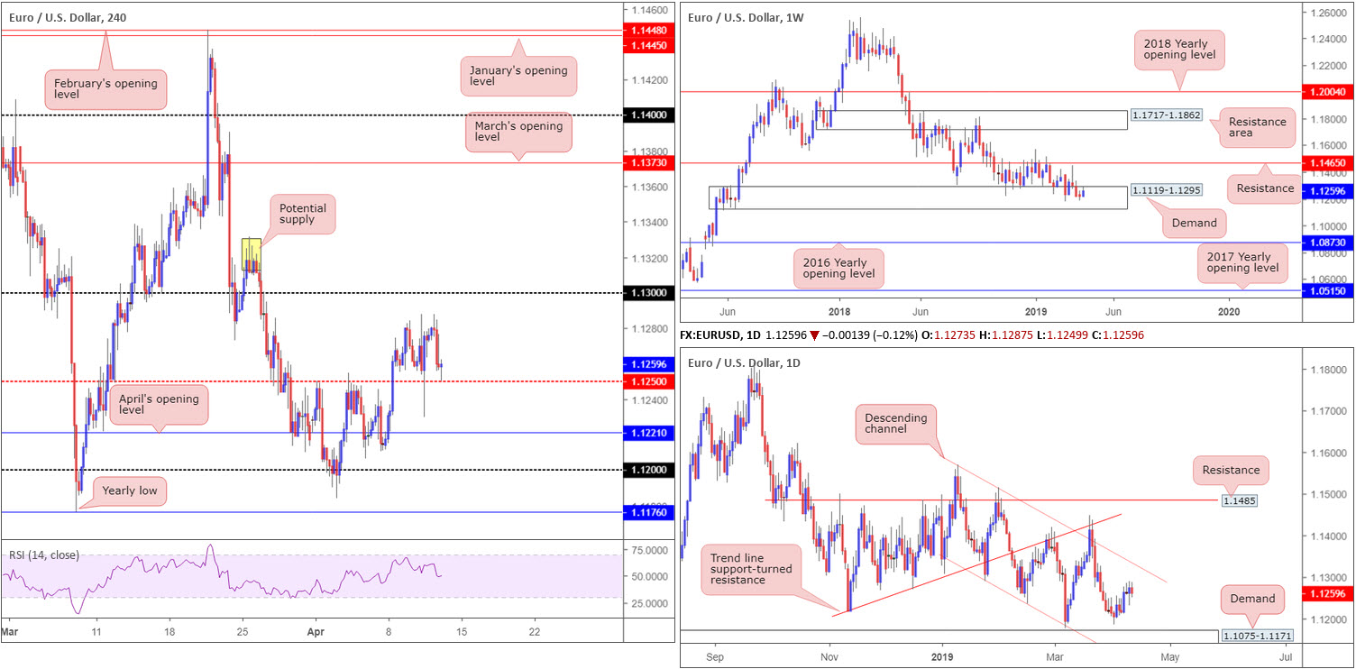The euro-to-dollar relationship on the H4 timeframe settled a few points north of 1.1250, following a modest bout of selling from familiar tops around 1.1284ish. Aside from this topping formation, traders may have also sketched in potential resistance from 1.13, trailed closely by supply at 1.1331/1.1310 (yellow). Sub 1.1250, however, has April’s opening level at 1.1221, and 1.12.