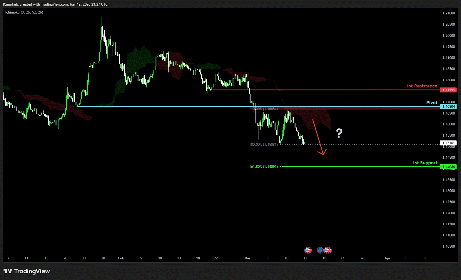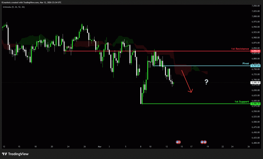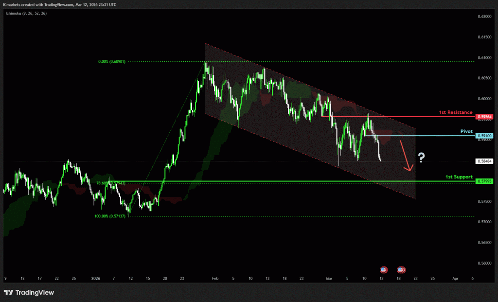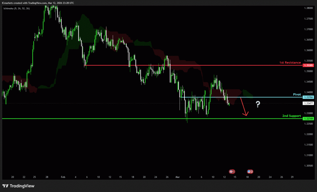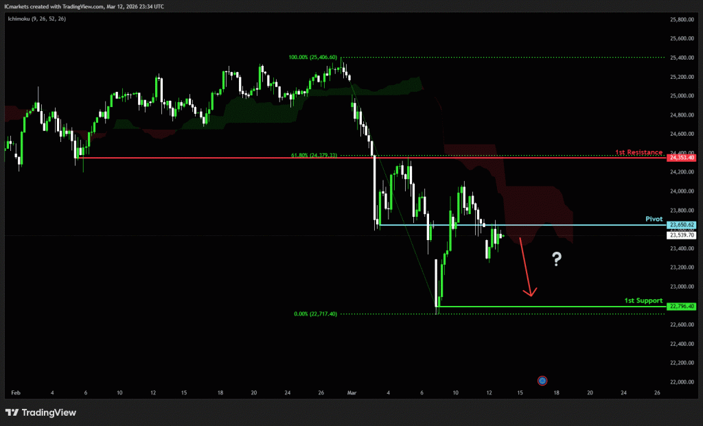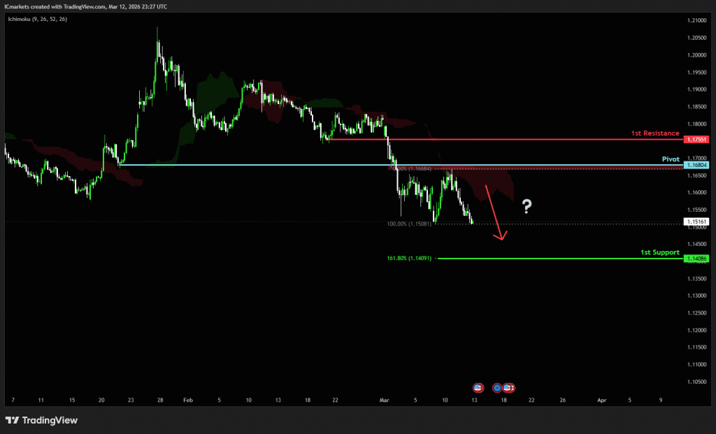 The price could see a short-term pullback toward the pivot before continuing its bearish move down toward the 1st support.