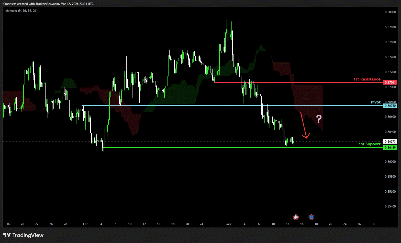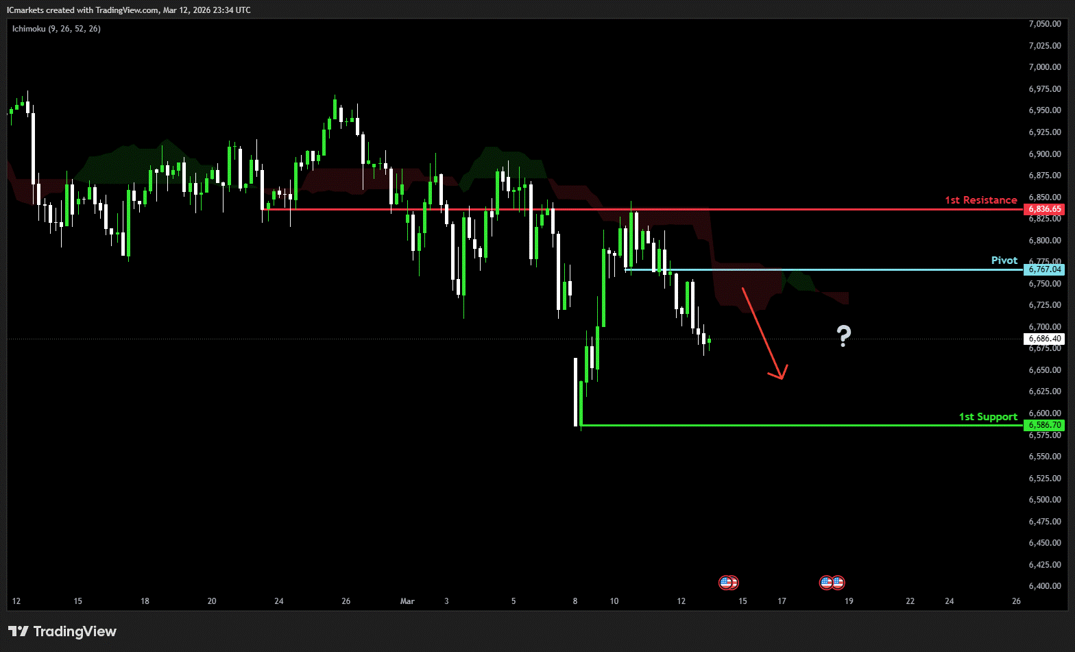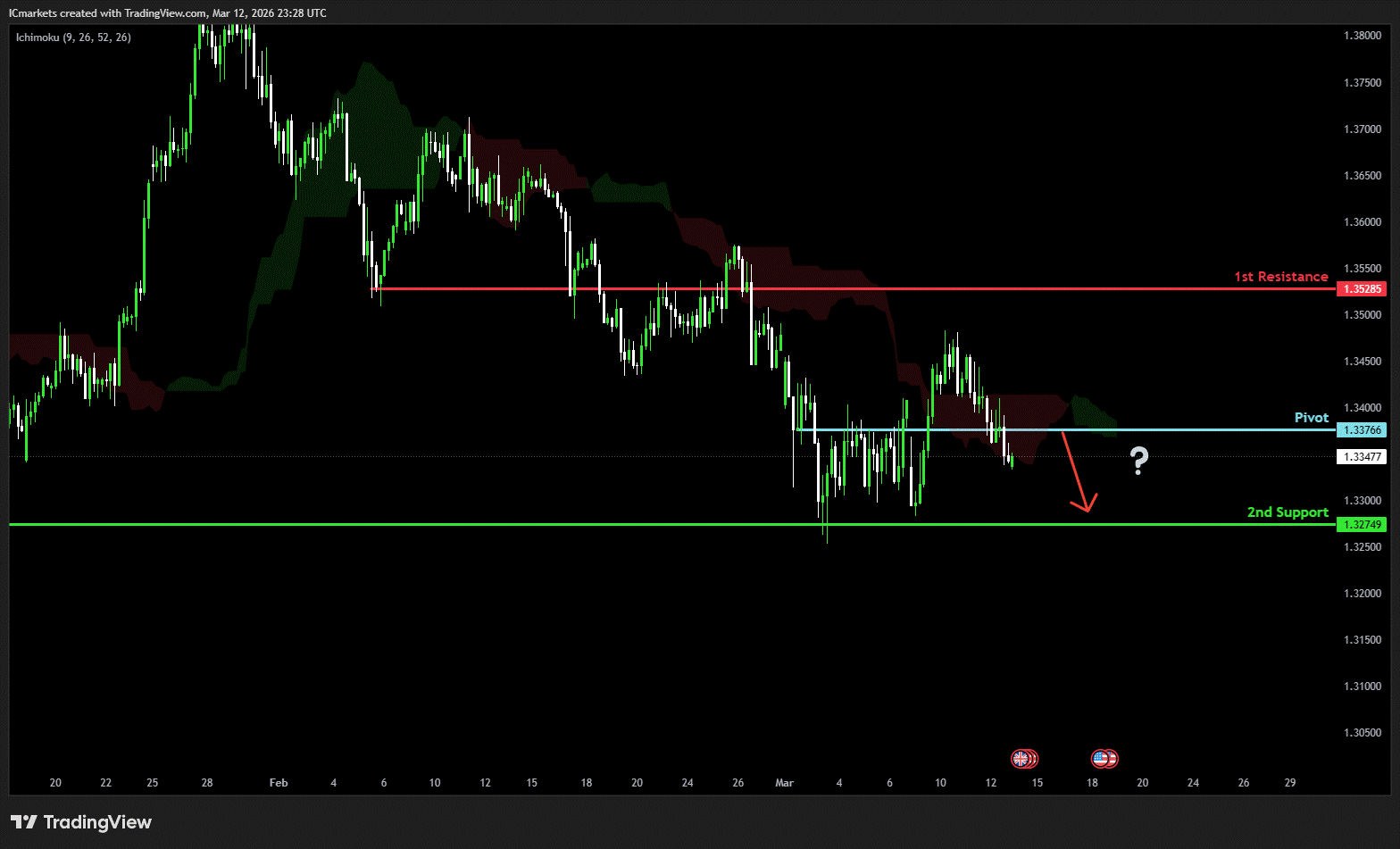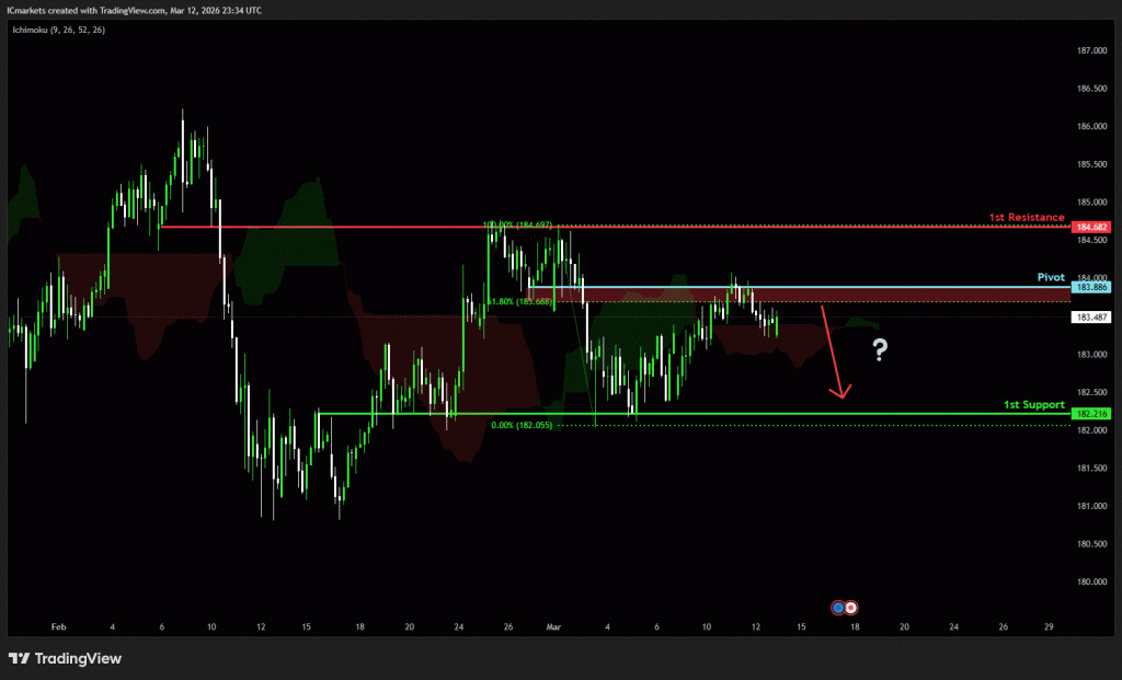 The price could see a short-term pullback toward the pivot before continuing its bearish move down toward the 1st support.