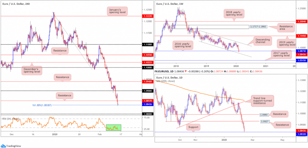 EUR/USD held on to the bulk of its losses Thursday after breaching H4 support at 1.0857, consequently shaking hands with a 161.8% Fibonacci extension at 1.0838. Yesterday’s descent, aside from a brief pause on February 11th, registered its eighth successive decline. The US dollar index continues to firm north of 99.00, despite dipping to lows of 98.85 during the session. Indicator-based traders might also be interested to note the EUR/USD’s relative strength index (RSI) has remained within oversold waters since February 6th.