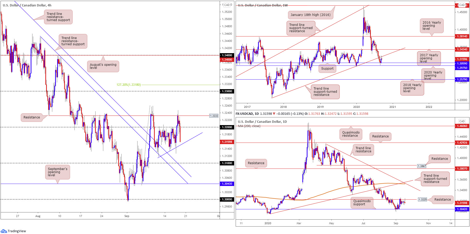Weekly price coming off trend line resistance and daily retesting resistance at 1.3225 is likely to force H4 under local trend line support (1.3119) today. This movement may have current sellers pyramid their positions and is also likely to attract fresh shorts to at least 1.31.