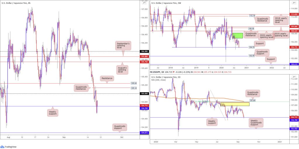 From the weekly timeframe, you’ll note the level has capped downside since April 2018. For that reason, although sellers have exhibited a dominant existence this week, buyers could retaliate from the weekly base and approach 105 on the H4 as an initial resistance.