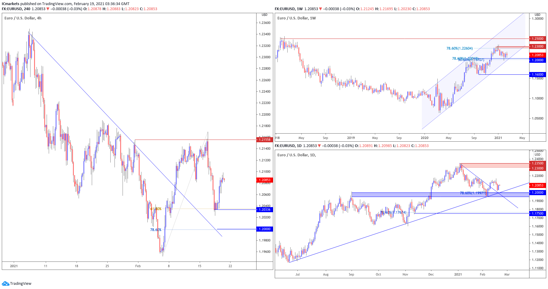 Looking at the weekly chart, we can see that prices are testing the support area of our ascending channel at 1.200, which coincides with the 50% Fibonacci retracement and 78.6% Fibonacci extension. We could see a further upside to test our resistance area at 1.2300, in line with the graphical swing high resistance and 78.6% Fibonacci extension. On the daily time frame, prices are holding nicely above the ascending trend line and support area at 1.200 which can also be found on the weekly time frame.