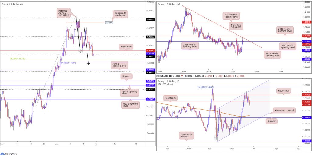 Meanwhile, price action on the weekly timeframe is seen attempting to nudge through the 2020 yearly opening level from 1.1222 after fading long-standing trend line resistance, extended from the high 1.2555. Beneath 1.1222, the 2016 yearly opening level at 1.0873 is noted as support. In view of the long-term trend, the pair has also remained under pressure since topping in early February 2018.