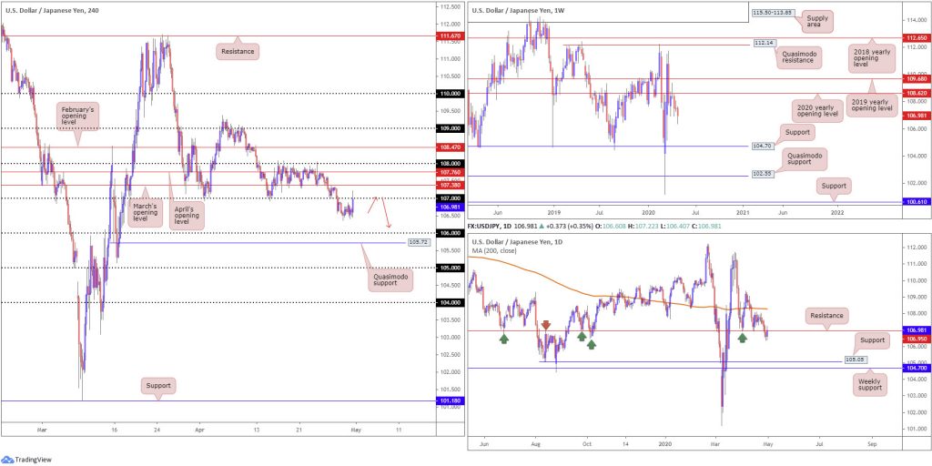 In terms of the weekly timeframe, nevertheless, the chart continues to emphasise a bearish tone. Price action recently produced a clear-cut shooting star candlestick configuration off the 2020 yearly opening level at 108.62, with a strong follow-through move to the downside to lows of 106.92 seen thereafter. This week, as you can see, is extending space sub 108.62, with support not expected to emerge until reaching 104.70.