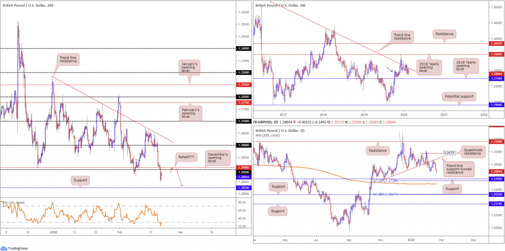 On a wider perspective, we have the weekly timeframe languishing beneath long-standing trend line resistance, pencilled in from the high 1.5930, though demand around the 1.2939 region is also still in motion (black arrow). Continued downside may imply a break of the said demand, tripping sell stops and testing the 2019 yearly opening level at 1.2739. A break higher, on the other hand, could see the 2018 yearly opening level enter the fight at 1.3503.