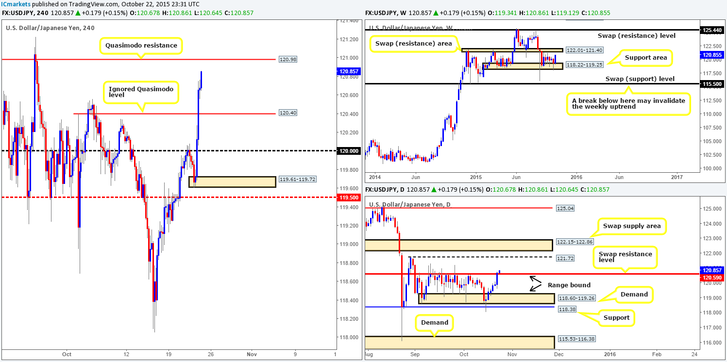 In all honesty, we’re unsure of this pair right now. Taking a short from 120.98 is risky since only forty pips above it sits the underside of the aforementioned weekly range (swap) resistance area. Conversely, entering long from 120.40 is the more logical of the two in our opinion. However, this could just be another fakeout above the aforementioned daily range resistance, thus placing any longs taken from here under pressure.