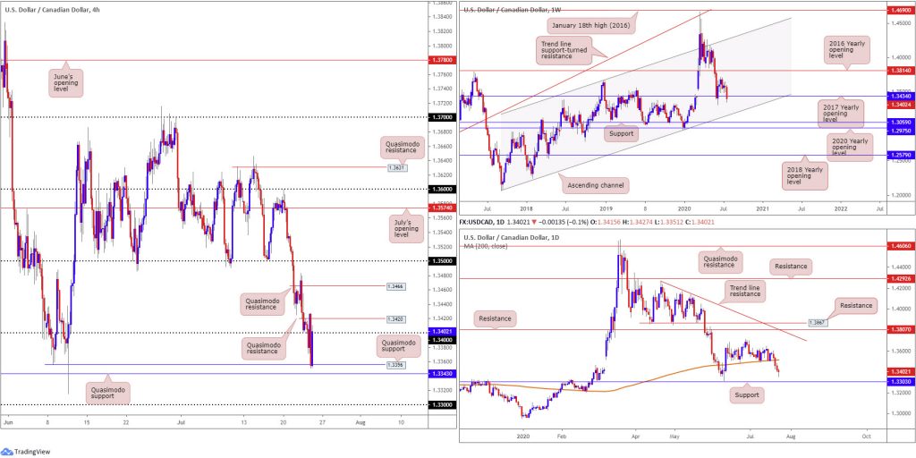 Over the course of Thursday’s session, we penetrated 1.34 to the downside on the H4 and fleetingly visited Quasimodo support at 1.3356. The response from here, as you can see, was prominent, enough to draw H4 back to the underside of 1.34, located just south of Quasimodo resistance at 1.3420. The US dollar Index remained south of 95.00, with WTI also trading in negative territory sub $42.00/bbl.