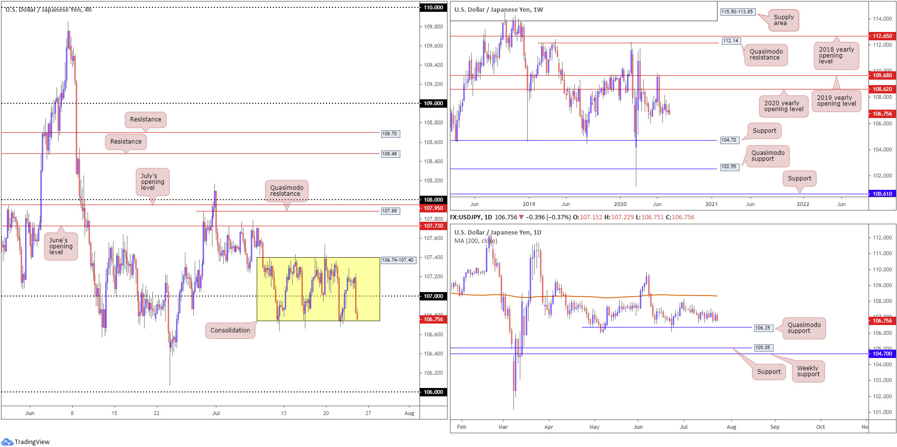 Further out on the weekly timeframe, price is seen consolidating beneath the 2020 yearly opening level at 108.62. Support, on the other hand, can be derived from the 105.98 6th May low, with a breach uncovering long-term support plotted at 104.70. Candle action on the daily timeframe remains focused on Quasimodo support from 106.35 and the 200-day SMA (orange – 108.33) as resistance, assuming we can pass the 108.16 July 1st high.