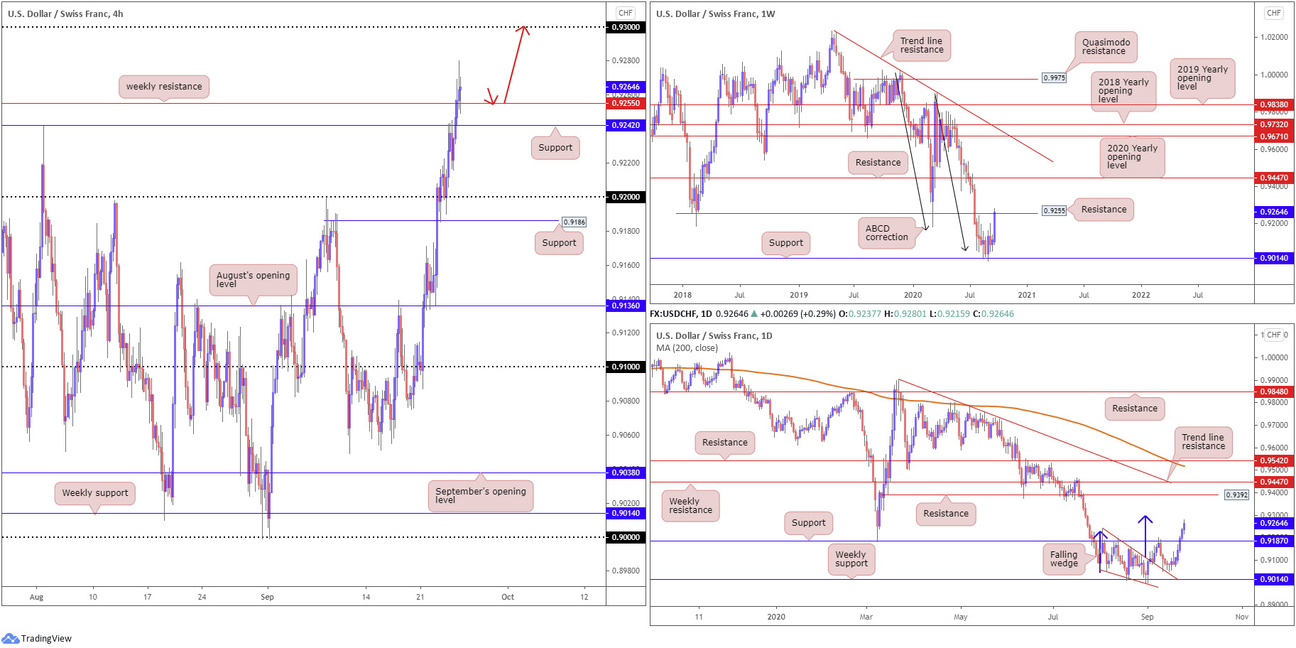 From the daily timeframe, the beginning of September observed the upper border of a falling wedge pattern (drawn from the high 0.9241 and a low of 0.9056) give way, consequently unlocking a bullish reversal signal. Although resistance at 0.9187 initially put a lid on gains, buyers regained consciousness after retesting the falling wedge and recently engulfed the aforementioned resistance level. Breaking through weekly resistance at 0.9255 is likely to guide the currency pair towards the daily falling wedge take-profit target (blue arrows) at 0.9297.