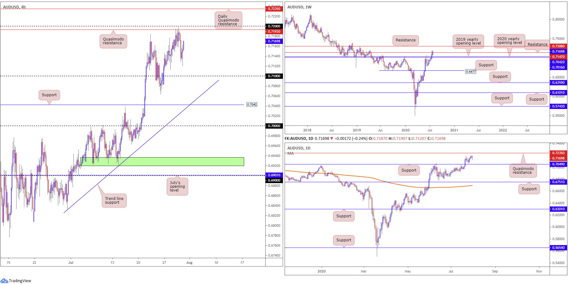 With that in mind, and noting yesterday’s action on the H4 failed to reach 0.71, are we still looking at a run through orders at 0.72 on the H4 timeframe towards daily Quasimodo resistance at 0.7235? While the latter sits as an initial upside target; buyers will also likely target the 0.73 handle and, of course, weekly resistance at 0.7308.