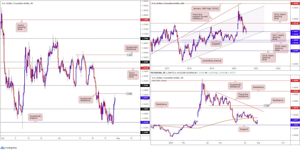 Although buyers appear to have the upper hand right now, at least according to the higher timeframes, H4 traders may seek a close above Quasimodo resistance at 1.3466 before engaging, with the expectation of a follow-through move north of 1.35 to reach 1.3520ish, the 200-day SMA.