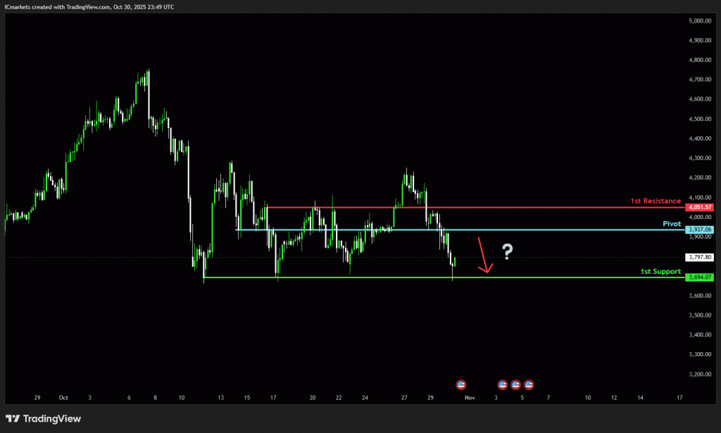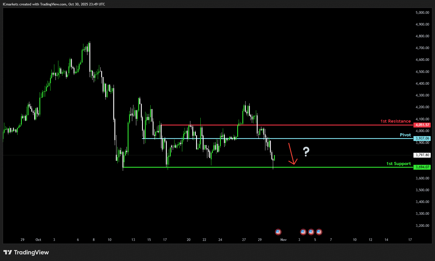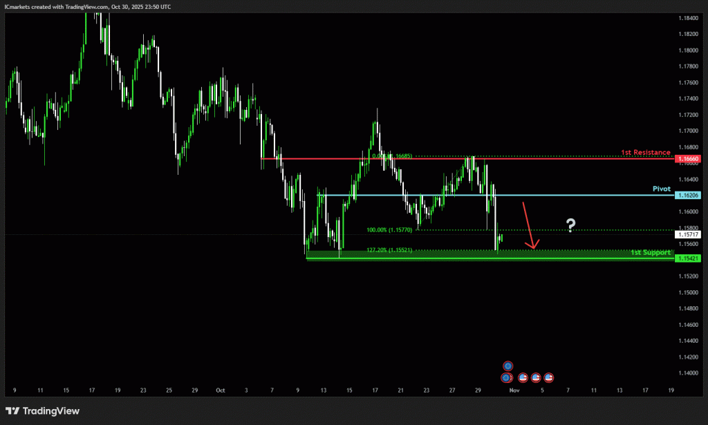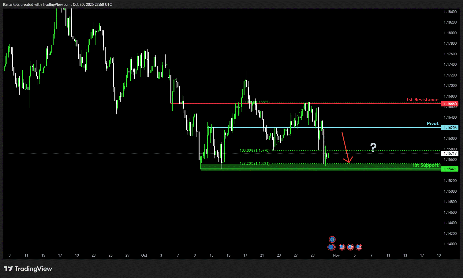 The price could see a short-term pullback toward the pivot before continuing its bearish move down toward the 1st support.