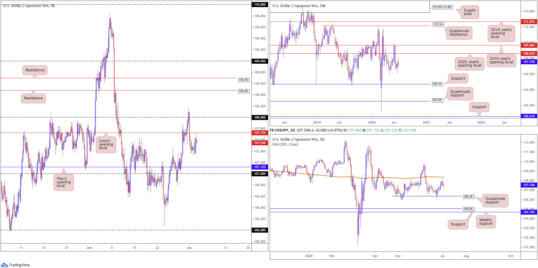 Stellar US jobs data lifted USD/JPY on Thursday, topping just south of June’s opening level at 107.73 on the H4 timeframe.