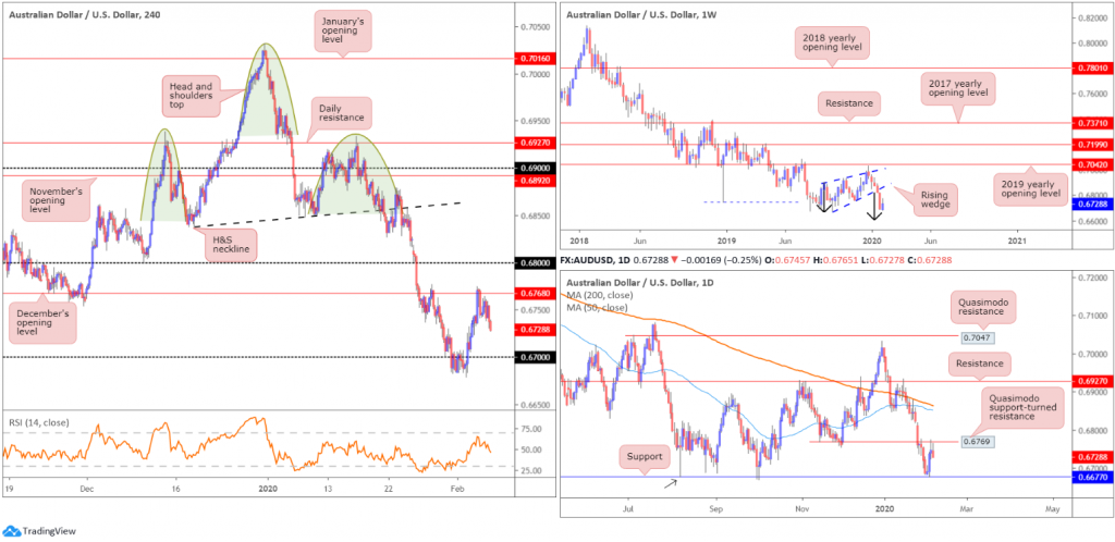Despite posting a modest advance during the first half of the week, AUD/USD struggled to sustain gains above December’s opening level at 0.6768, based on the H4 timeframe. Technical selling from 0.6768 and daily Quasimodo support-turned resistance at 0.6769, along with lower-than-expected Australian data and a strong USD, the pair snapped a three-day winning phase and erased more than 0.20%.