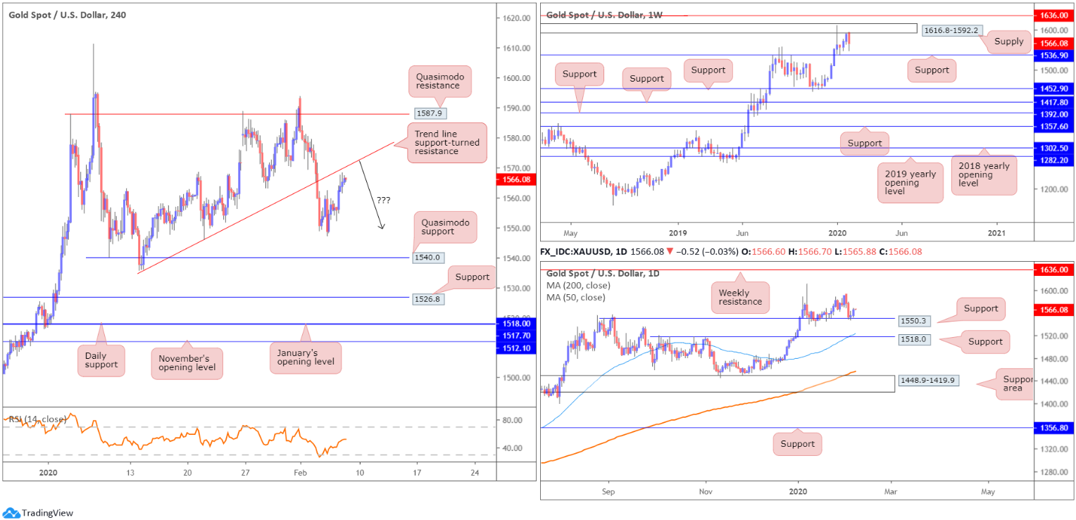 Developments on the technical front has H4 stationed south of trend line support-turned resistance, taken from the low 1536.2. Continued bidding from here invites an approach towards Quasimodo resistance coming in at 1587.9, whereas a rejection, aside from Wednesday’s low at 1547.6, has Quasimodo support at 1540.0 to target.