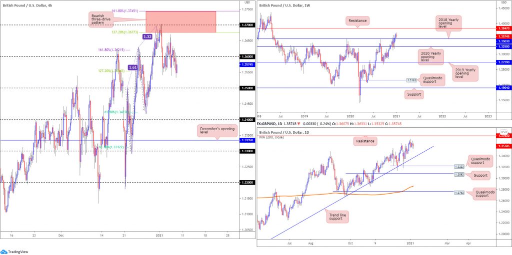Further out on the weekly timeframe, price currently fades 2021 yearly peaks at 1.3703, on track to possibly cross swords with support at 1.3503, the 2018 yearly opening value. To the upside, resistance at 1.3847 is on the radar. Also of technical interest is a recent engulf of 1.3514 (December 9 [2019] high), helping to confirm the current uptrend. From the daily timeframe, price is seen hovering between 1.3763 resistance (previous Quasimodo support level) and trend line support, etched from the low 1.1409.