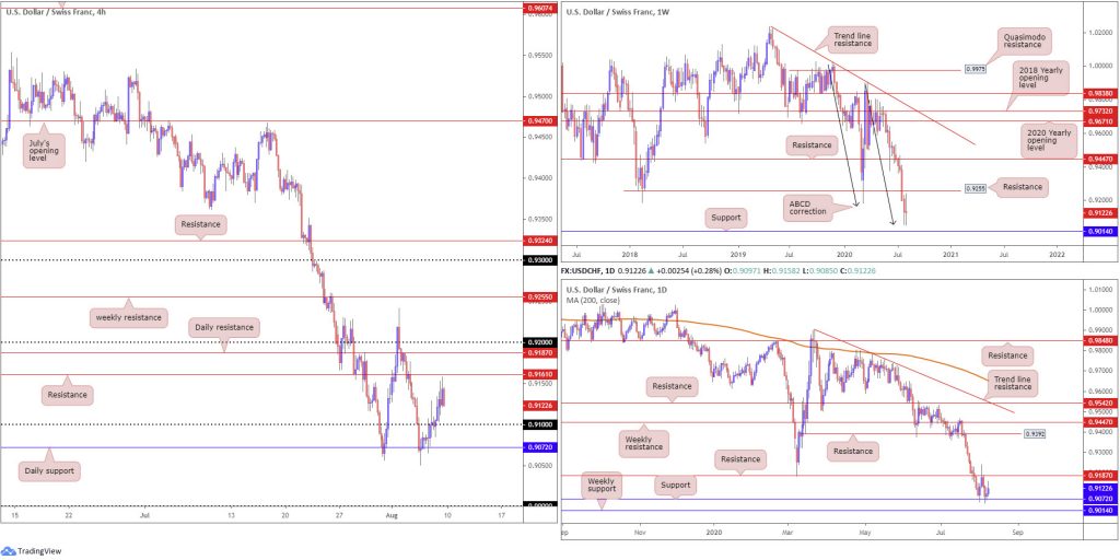 Before buyers step in, however, traders may observe a 0.91 (H4) retest materialise, with the possibility of a fakeout to daily support at 0.9072. Conservative traders may seek additional candlestick confirmation off 0.91 before committing, targeting H4 resistance at 0.9161 as an initial point.