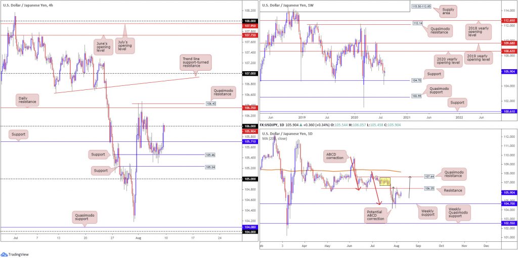 Going on the above, H4 traders might witness price climb through resistance at 105.71 to ignite intraday bullish themes to at least 106 and, dependent on the outcome of today’s US job’s data, possibly daily resistance at 106.35. Conservative buyers may seek additional confirmation before pulling the trigger (a retest forming at 105.71, for example).