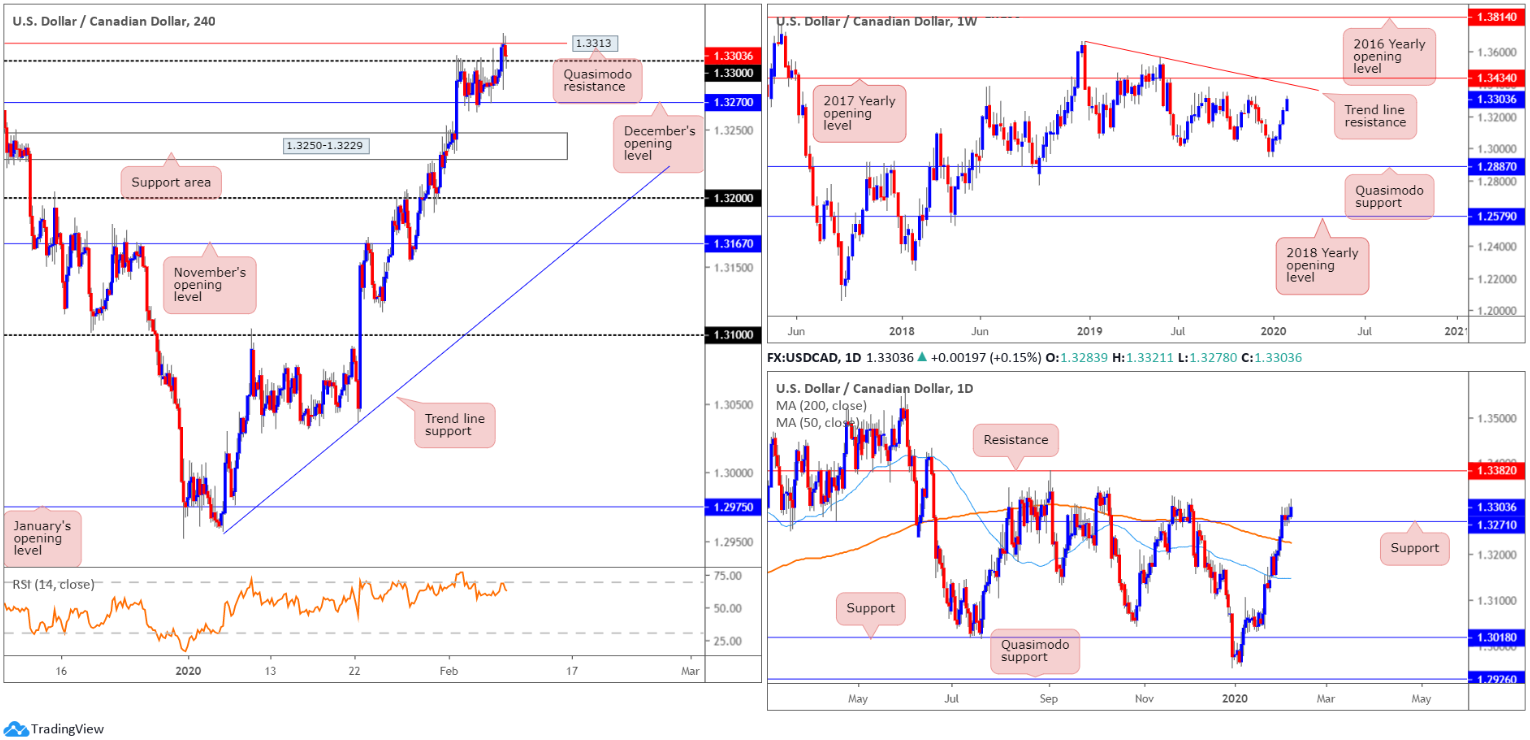 USD/CAD recorded its fifth successive gain last week, adding more than 65 points. Leaving Quasimodo support at 1.2887 unchallenged, and tripping longer-term sell stops beneath the 1.3015 July 15th (2019) low, price action now trades around tops at 1.3317, with trend line resistance (1.3661) and the 2017 yearly opening level at 1.3434 also in sight.