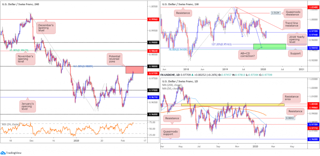 While weekly price suggests the possibility of additional buying this week, the combination of daily resistance at 0.9771/50-day SMA and the round number at 0.98/161.8% Fibonacci extension, as well as RSI confirmation, is likely enough to attract sellers (red zone on H4).