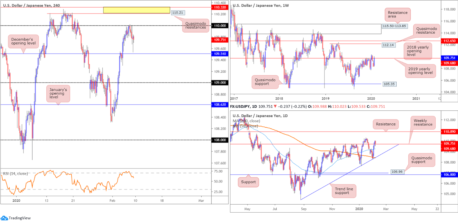 After scoring a weekly low of 108.31, USD/JPY bulls entered a bullish phase, consequently reconnecting with the 2019 yearly opening level at 109.68. A decisive push above the said barrier underlines a possible approach towards Quasimodo resistance at 112.14, closely followed by the 2018 yearly opening level at 112.65, over the coming weeks.