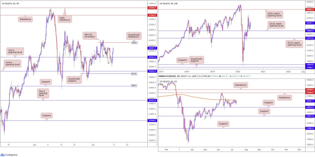 Price action on the H4 timeframe found a footing off AB=CD structure (black arrows) at 25518. As of the week’s close, we can see movement overthrew July’s opening level at 25761 and re-joined peaks around 26107. Above this point, traders’ crosshairs are likely fixed on the 200-day SMA at 26242, closely followed by H4 Quasimodo resistance at 26322.