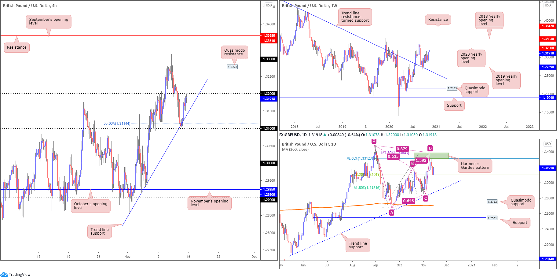 Despite sinking to a session low at 1.2928, the 2020 yearly opening value at 1.2975, arranged north of a Quasimodo support priced in at 1.2887, triggered a wave of buying last week, closing a touch off best levels.