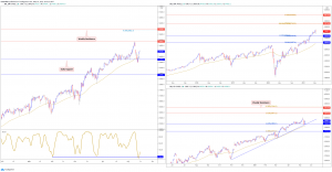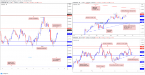 - Daily and weekly time frames showing price trending between resistances and support areas.