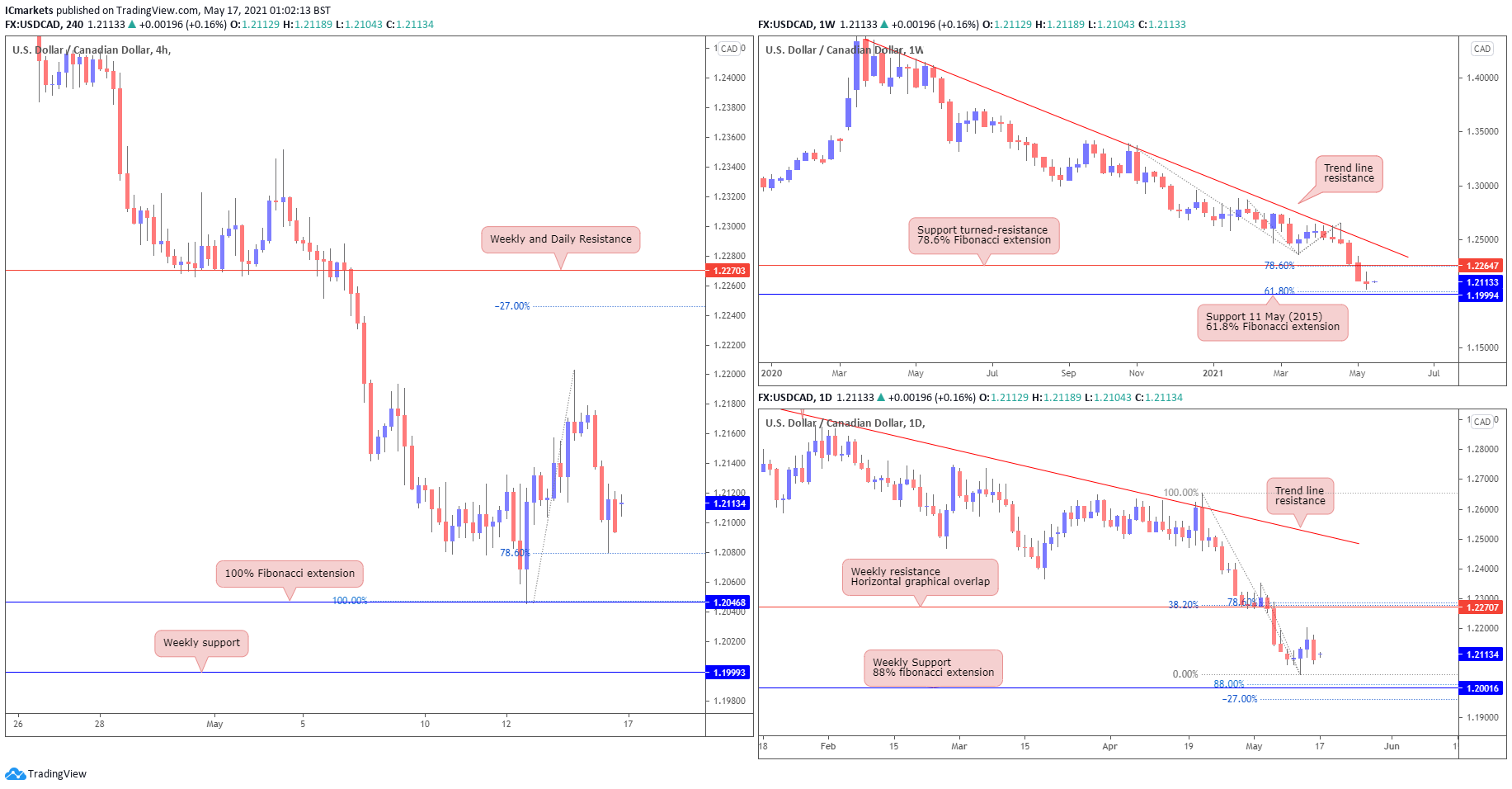 The weekly chart shows price breaking below the support level at 1.22647, in line with the 78.6% fibonacci extension. From here, we may see a further drop down towards the horizontal swing low from 11th May (2015).