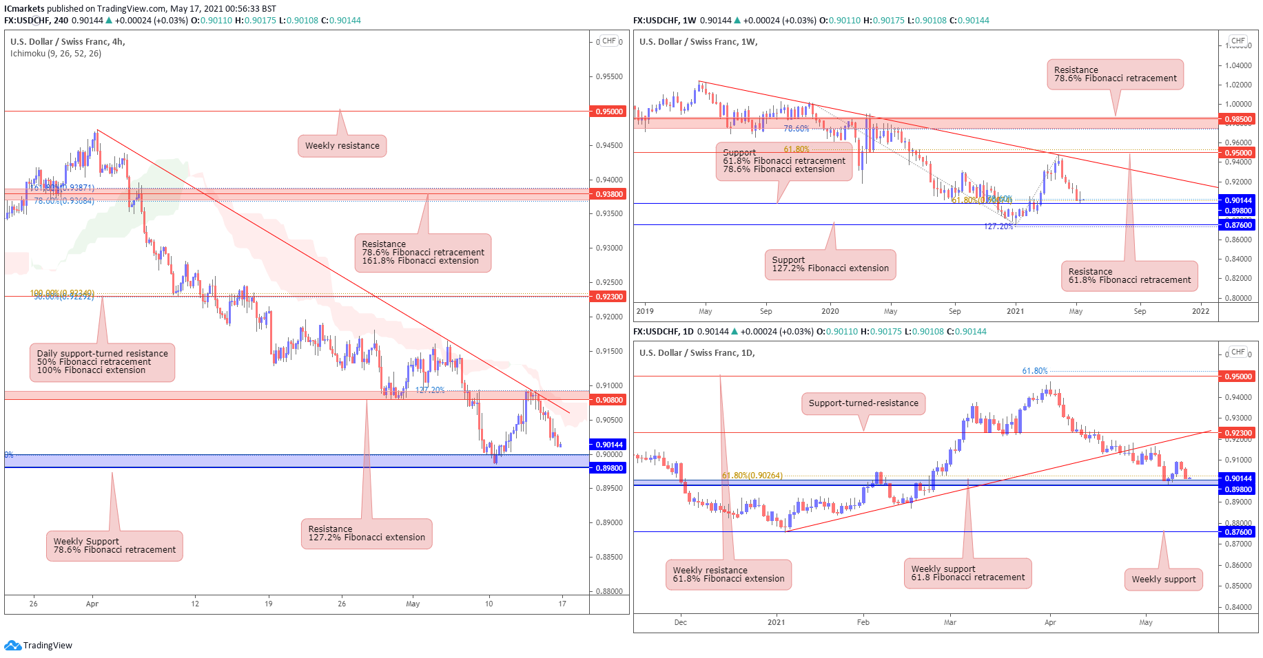 USD/CHF is now testing the weekly 0.89800 support, in line with 61.8% Fibonacci retracement and 78.6% Fibonacci extension. The daily chart shows that price is now holding below the key daily 0.92300 support-turned-resistance, and has also broken below the ascending trendline support-turned-resistance. The weekly 0.89800 support level is a key level to watch.