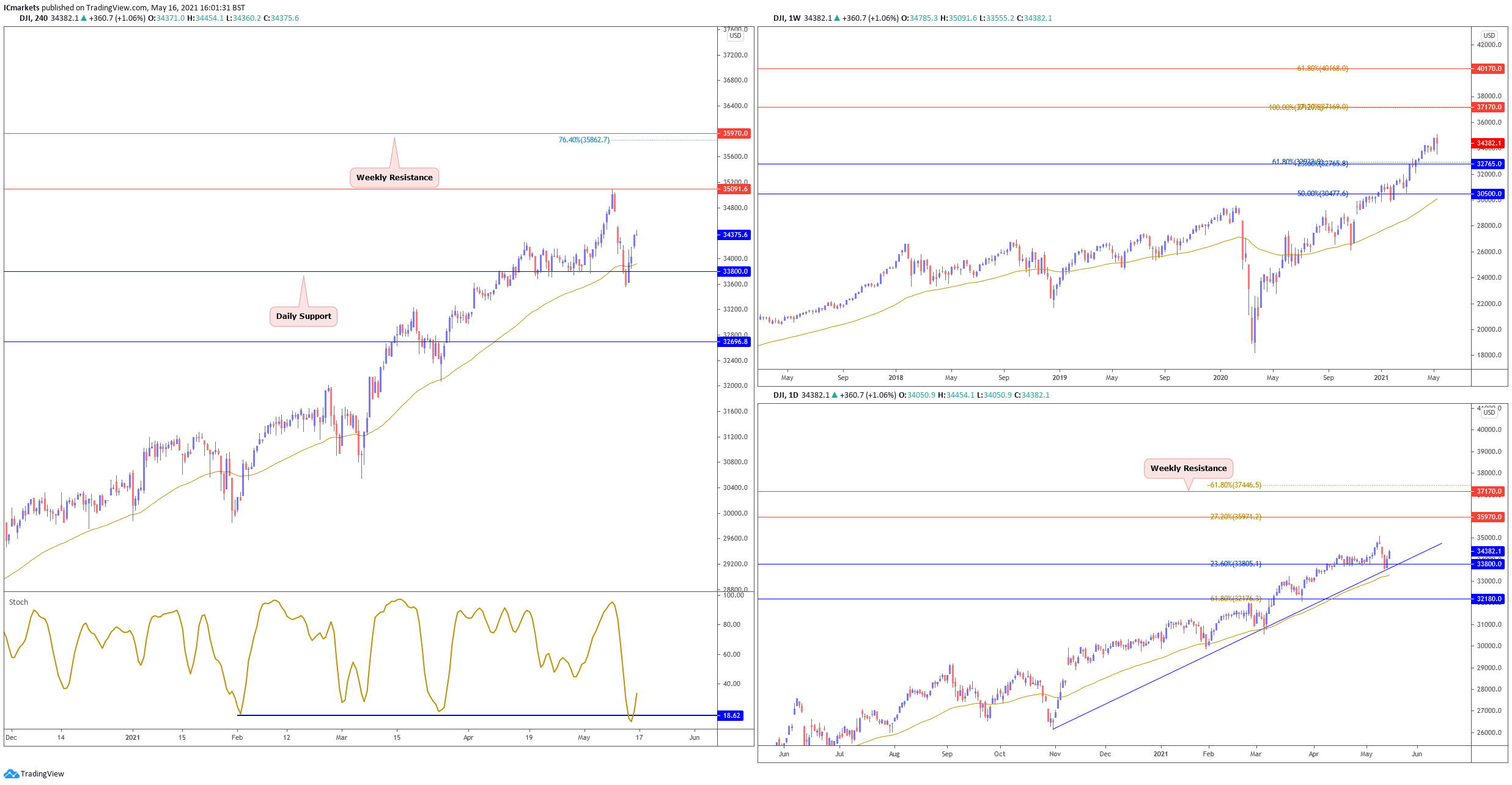 On the weekly chart, price traded sideways. With price holding above long term moving average, we can expect further bullish pressure above 32765 support. On the daily chart, price pulled back lower and reacted above moving average and also above ascending trendline support. It is possible to see buyers add to their longs above 33800 support with upside target at 35970 resistance. Otherwise, price could also swing the other way towards 32180 support.