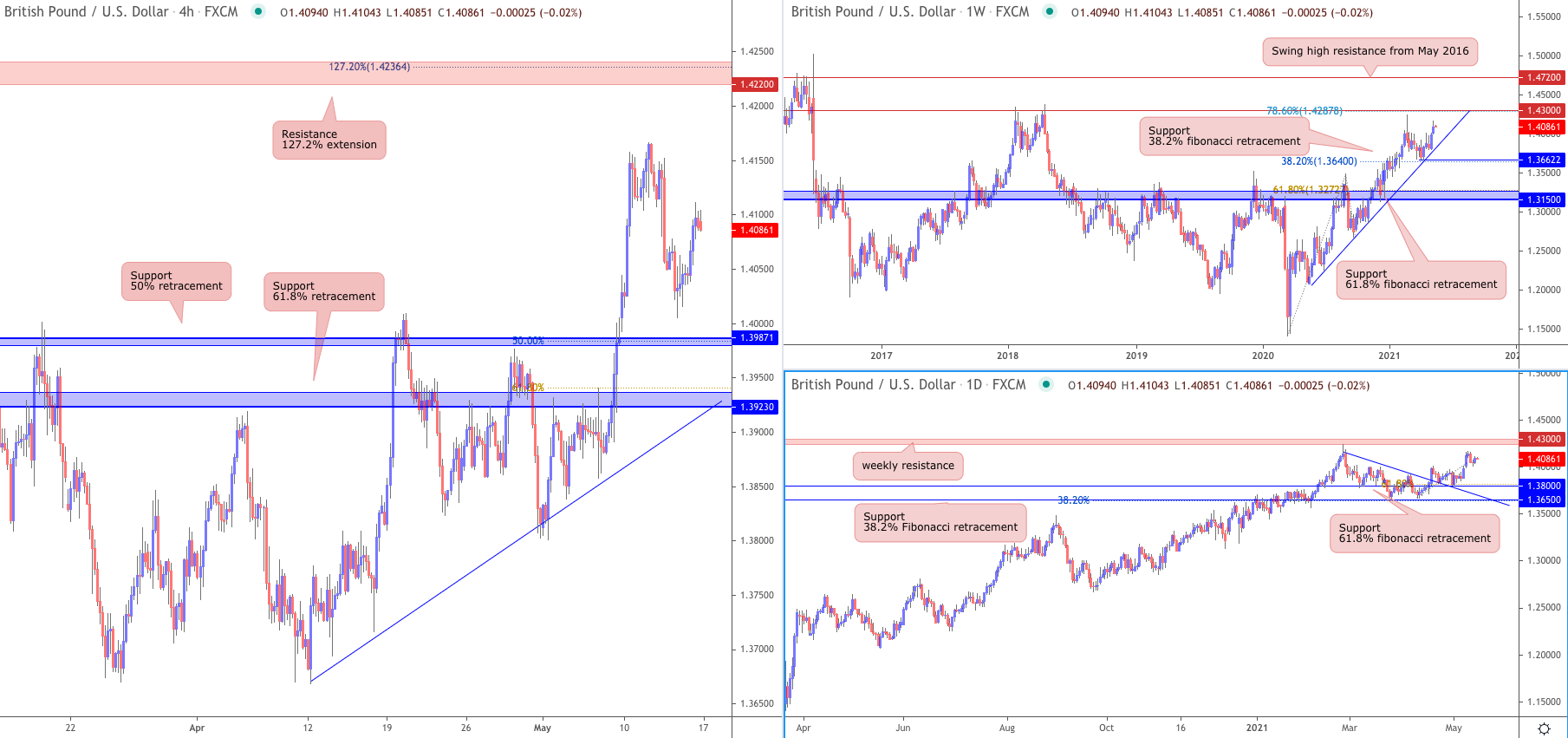 Looking at the weekly chart, we can see that prices are facing bullish pressure from our ascending trend line and support at 1.36622 where we could see a further upside above this level to our resistance target at 1.43000, in line with the 78.6% fibonacci extension. The daily time frame echoes the same bullish view as well where we could see a limited upside above our support level at 1.38000 with 1.43000 as our resistance target.