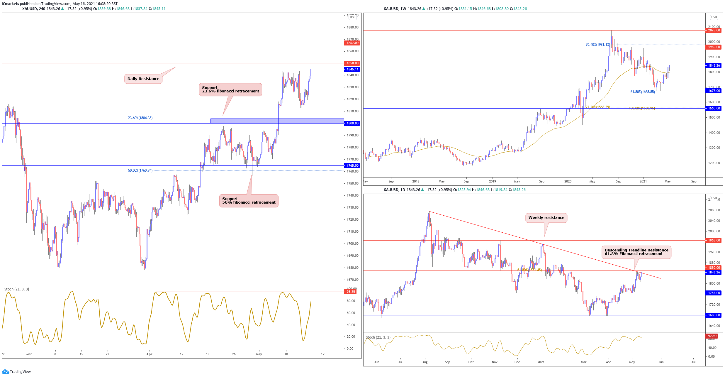 On the weekly timeframe, price pushed higher, closing above previous weekly resistance. We could see renewed bullish pressure this coming week. On the daily, price is still capped below daily descending trendline resistance. Price could see bearish pressure below 1850 resistance. Otherwise, a daily close and break above 1850 could see price push higher towards weekly resistance at 1965.