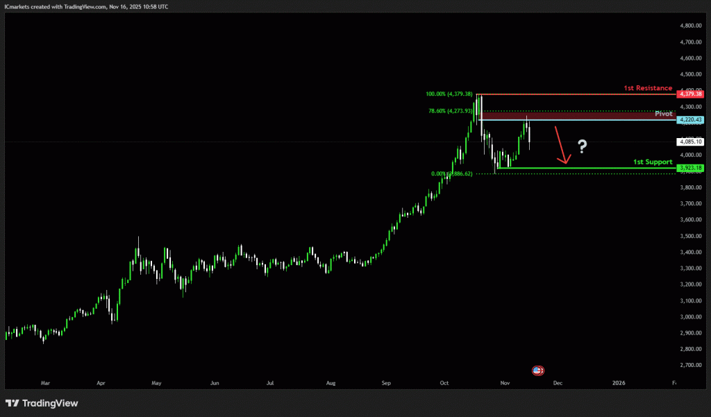 Supporting reasons: Identified as a pullback resistance that aligns closely with the 78.6% Fibonacci retracement, where selling pressures could intensify and potentially cap any upward retracement.