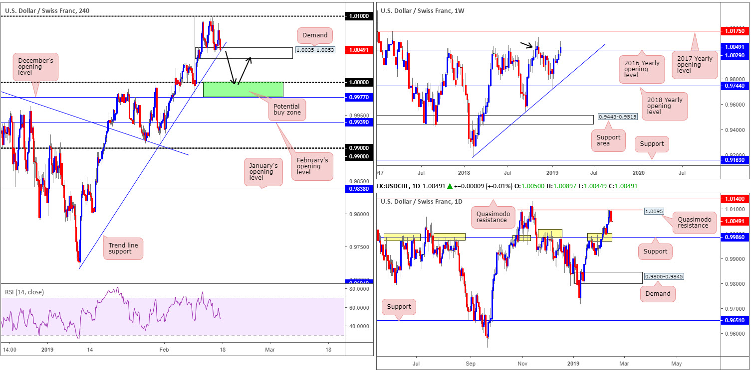 The USD/CHF, as you can see, remains trading with a reasonably strong bias to the upside, recording its third consecutive weekly gain in recent trade. While the unit is attempting to establish some ground above the 2016 yearly opening level at 1.0029, the barrier’s history as a resistance may still draw in sellers as it did in November 2018 (black arrow).
