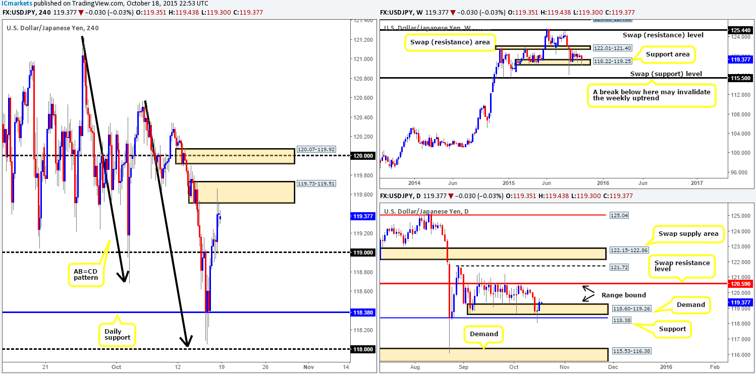 Daily view:Similar to its bigger brother (the weekly timeframe), daily action also saw a break lower from its current range between demand at 118.60-119.26 and a swap resistance level at 120.59. However, as you can see, there was effectively no close lower. In fact, price hit bids at a near-term support just below at 118.38 and closed back within the above said demand going into by Thursday’s close 118.86 (forming of a long-legged doji candle) and continued to advance back into the range by the weeks end.
