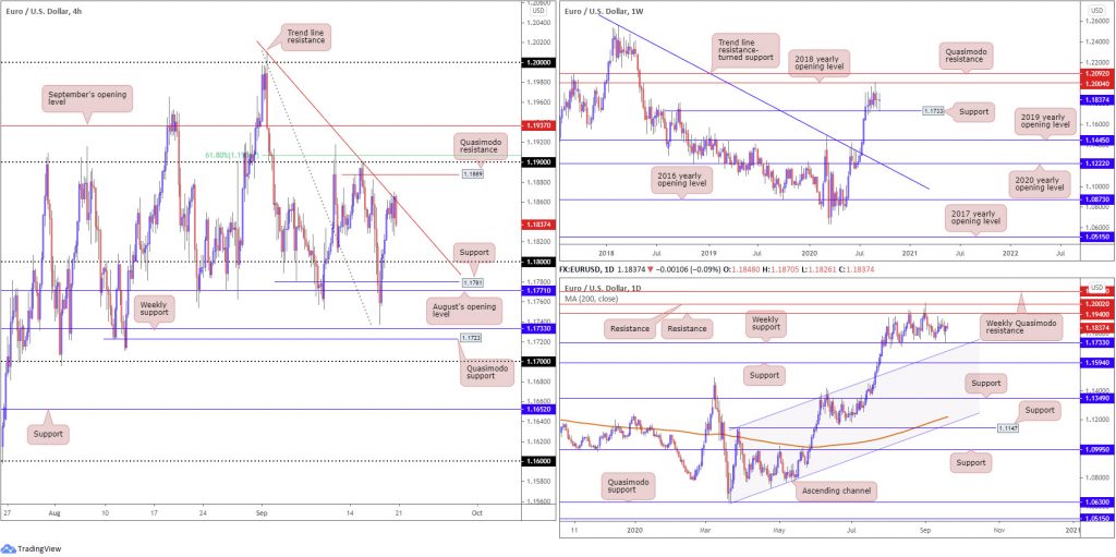 - September’s opening value at 1.1937 on the H4 is also interesting. Buy-stop liquidity above 1.19, together with daily resistance merging at 1.1940, is likely to see 1.1937 command attention should we reach this far north.