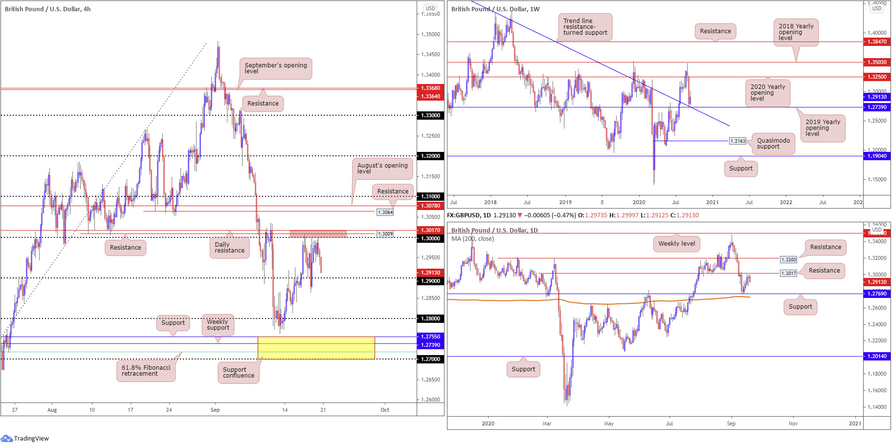 Following the prior week’s stronger-than-expected recovery off support at 1.3059, pinned just north of the 2020 yearly opening level at 1.2975, trend line support-turned resistance, taken from the low 1.2061, arrived on the scene. Although upside momentum has noticeably slackened here, recent trading managed to hold gains into the close.