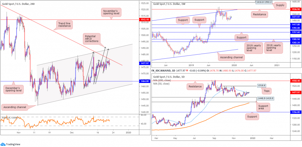 Price continues to inch closer to familiar trend line resistance, taken from the high 1557.1, missing the barrier by only a few points in recent movement. This follows a near-to-the-point recovery off December’s opening level at 1464.0. Note, the H4 candles have also been compressing within an ascending channel formation since bottoming at 1445.5 (high at 1478.8).
