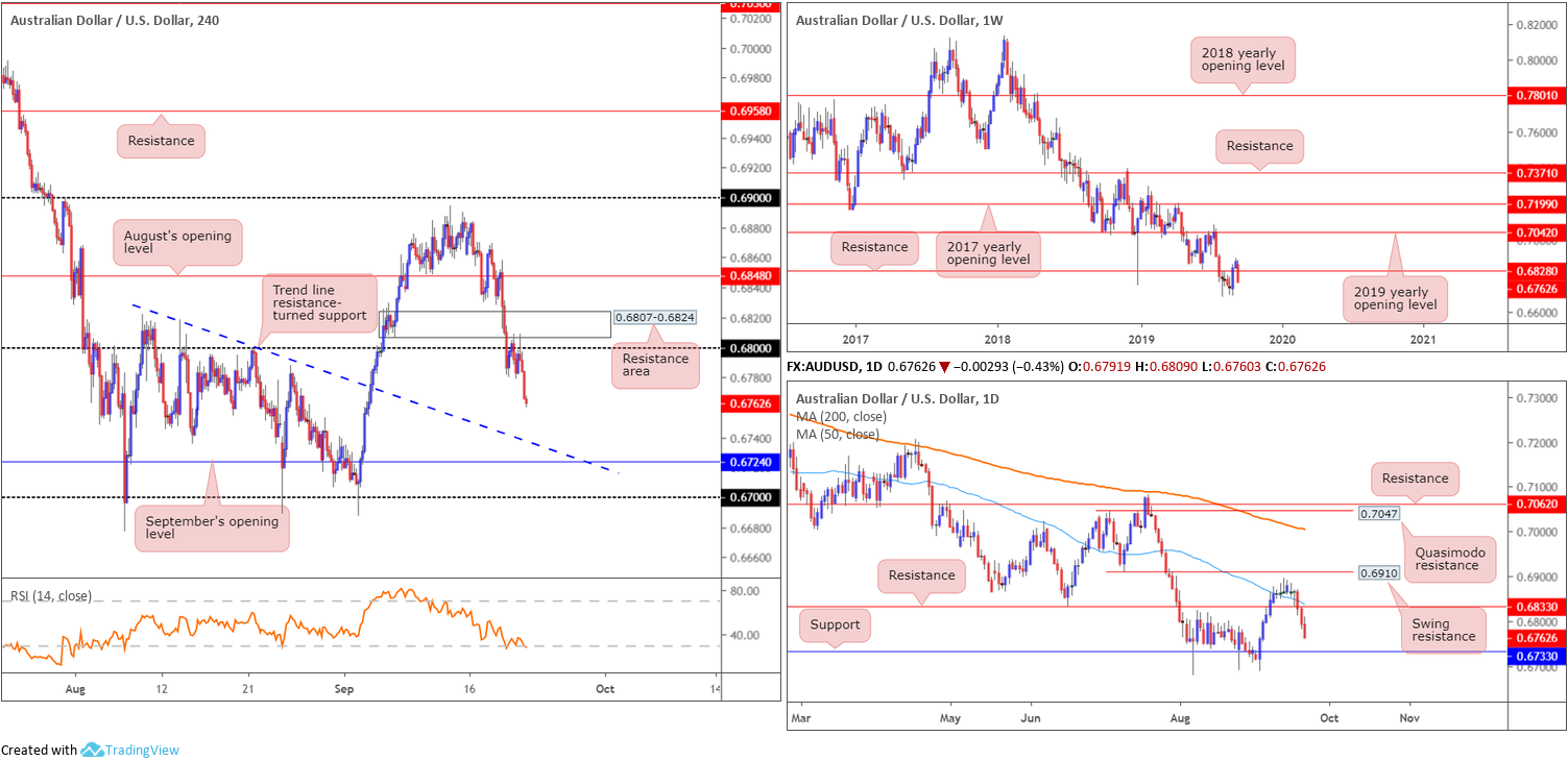 Keeping things simple this morning, all three timeframes analysed portend a move lower, with shorts based off the H4 bearish outside pattern formed from the underside of a H4 demand-turned resistance area at 0.6807-0.6824. As for downside targets, either the H4 trend line resistance-turned support (drawn from the high 0.6818) or daily support at 0.6733 offers a logical starting point, whichever hits first.