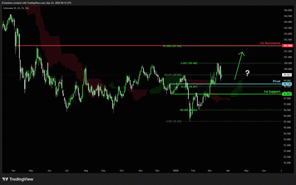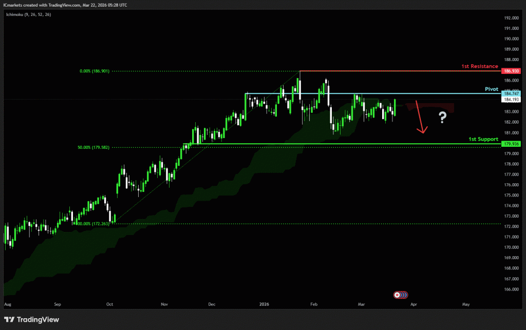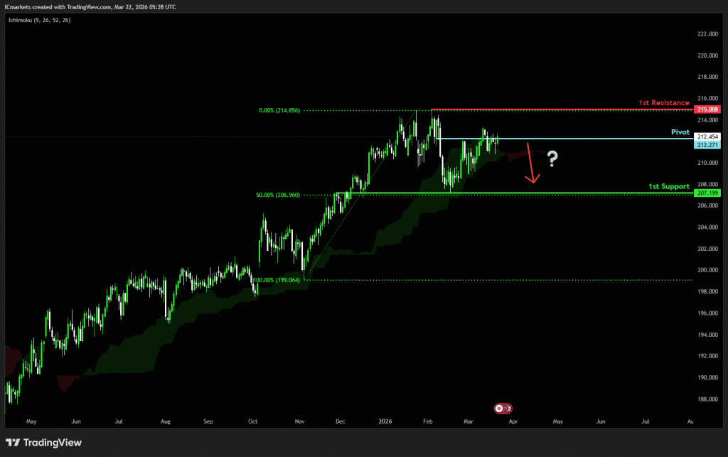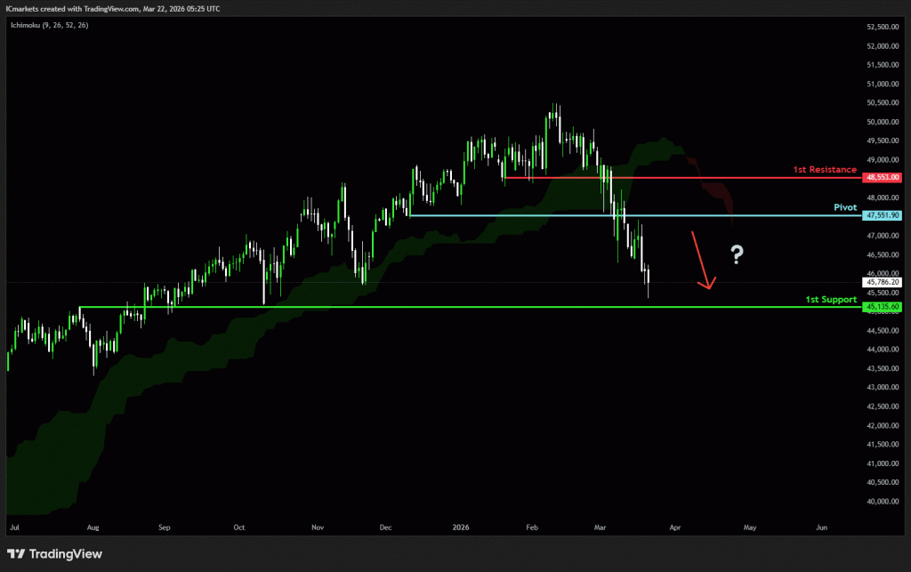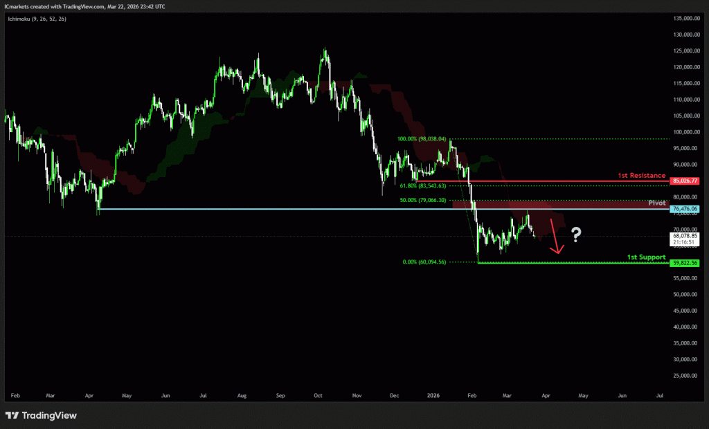 The price could see a short-term pullback toward the pivot before continuing its bearish move down toward the 1st support.
