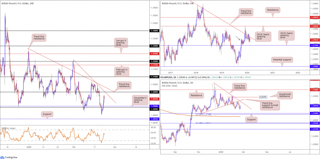 Weekly price is seen languishing beneath long-standing trend line resistance, pencilled in from the high 1.5930, though demand around the 1.2939 region is also still in motion (black arrow). Continued downside may imply a break of the said demand, tripping sell stops and testing the 2019 yearly opening level at 1.2739. A break higher, on the other hand, could see the 2018 yearly opening level enter the fight at 1.3503.
