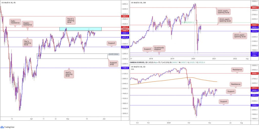 A familiar area of resistance worked its way into the spotlight in recent trading, a zone comprised of a daily resistance level at 24934 and weekly resistance, by way of the 2018 yearly opening level, at 24660 (blue). May’s opening level at 24121 is visible as the next downside target on the H4 timeframe, while a break above the higher-timeframe base could eventually land March’s opening level at 25823.
