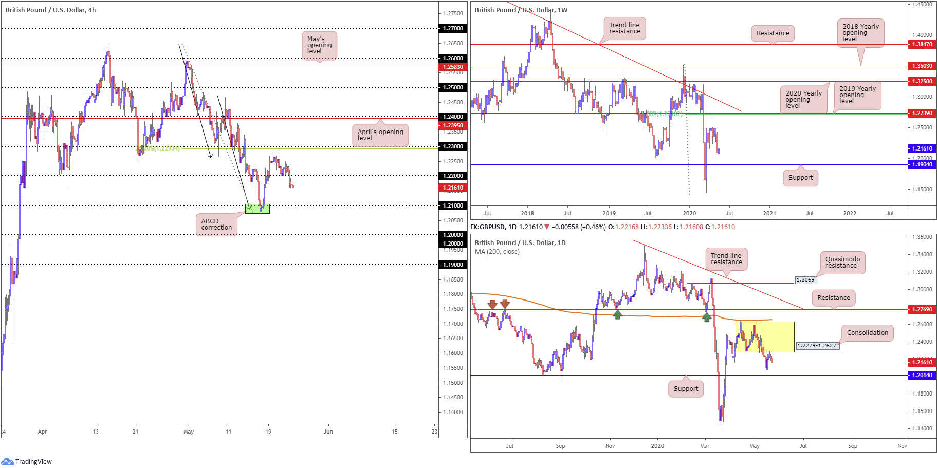 The daily window observed sellers make a stand off range lows at around 1.2279 last week. This is a retest situation which could, assuming an engulf south of 1.2075 (May 18 low), drift towards support coming in at 1.2014, a level boasting history dating as far back as late 2016.