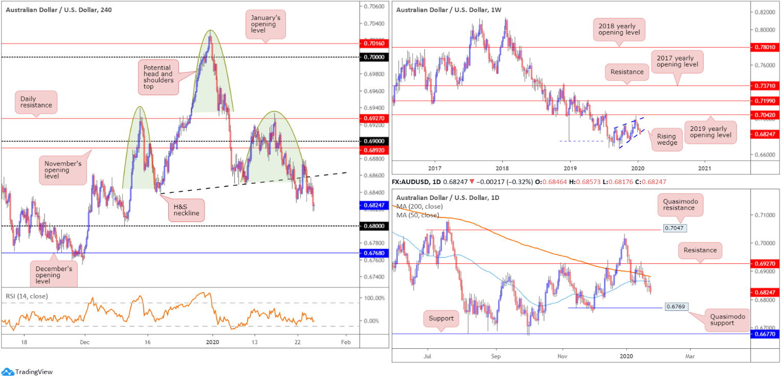 H4 price has been chalking up a potential head and shoulders top pattern since mid-December 2019 (left shoulder sports a top at 0.6938, right shoulder at 0.6933 and the head at 0.7031 – green). The neckline is drawn from the 0.6838 December 18 low and the 0.6850 January 9 low (black line). Traditionally, traders wait for a close beneath the neckline to trigger shorts; others, however, may attempt a short at the right shoulder or even at the formation of the head.