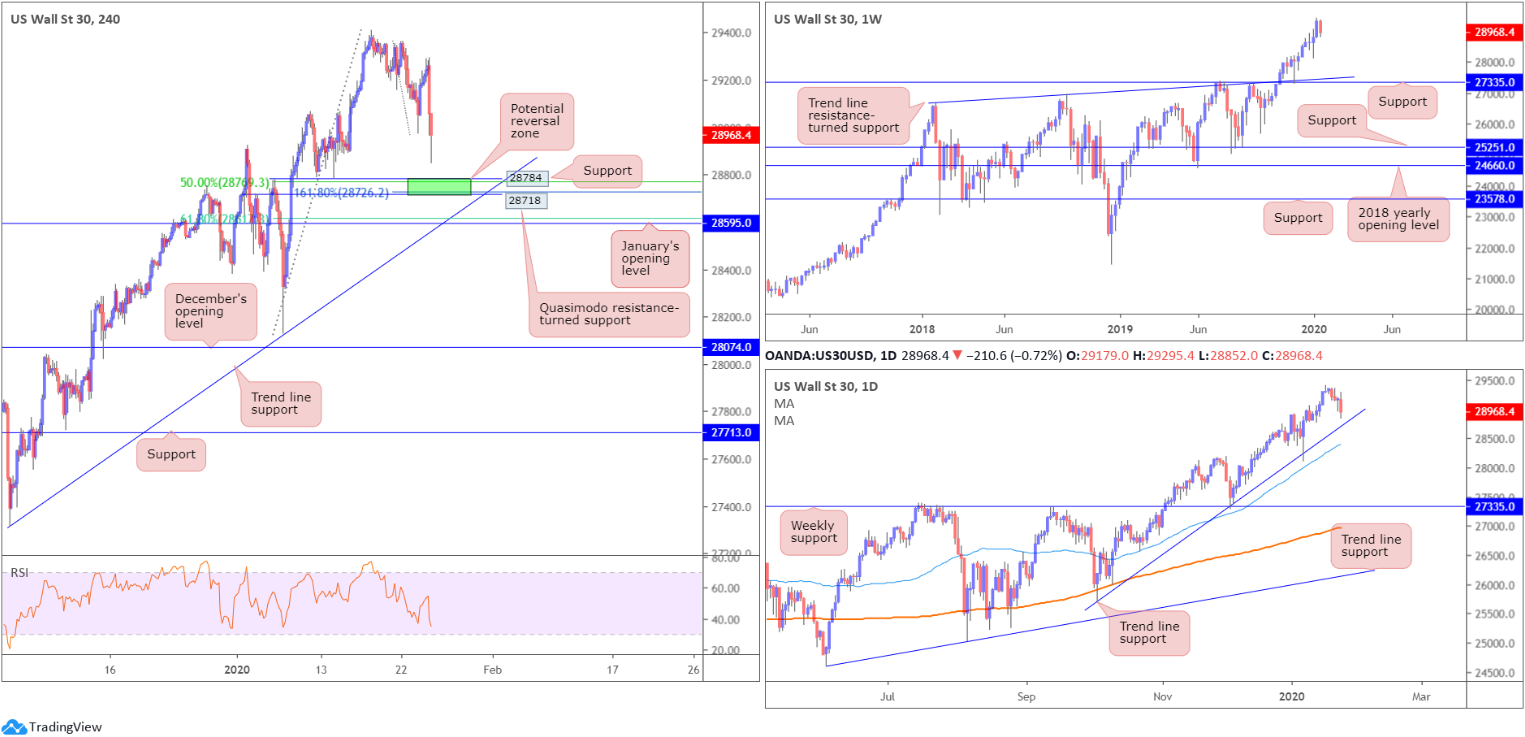 While 28718/28784 certainly has appeal for potential long opportunities this week, the possibility of a fakeout emerging through the said area to January’s opening level at 28595/the 61.8% Fibonacci retracement at 28621 is certainly there. For that reason, entering based on additional confirmation might be an idea. This could be something as simple as a H4 bullish candlestick signal, or drilling down to the lower timeframes and attempting to enter based off lower-timeframe structure, a trend line break/retest, for example.