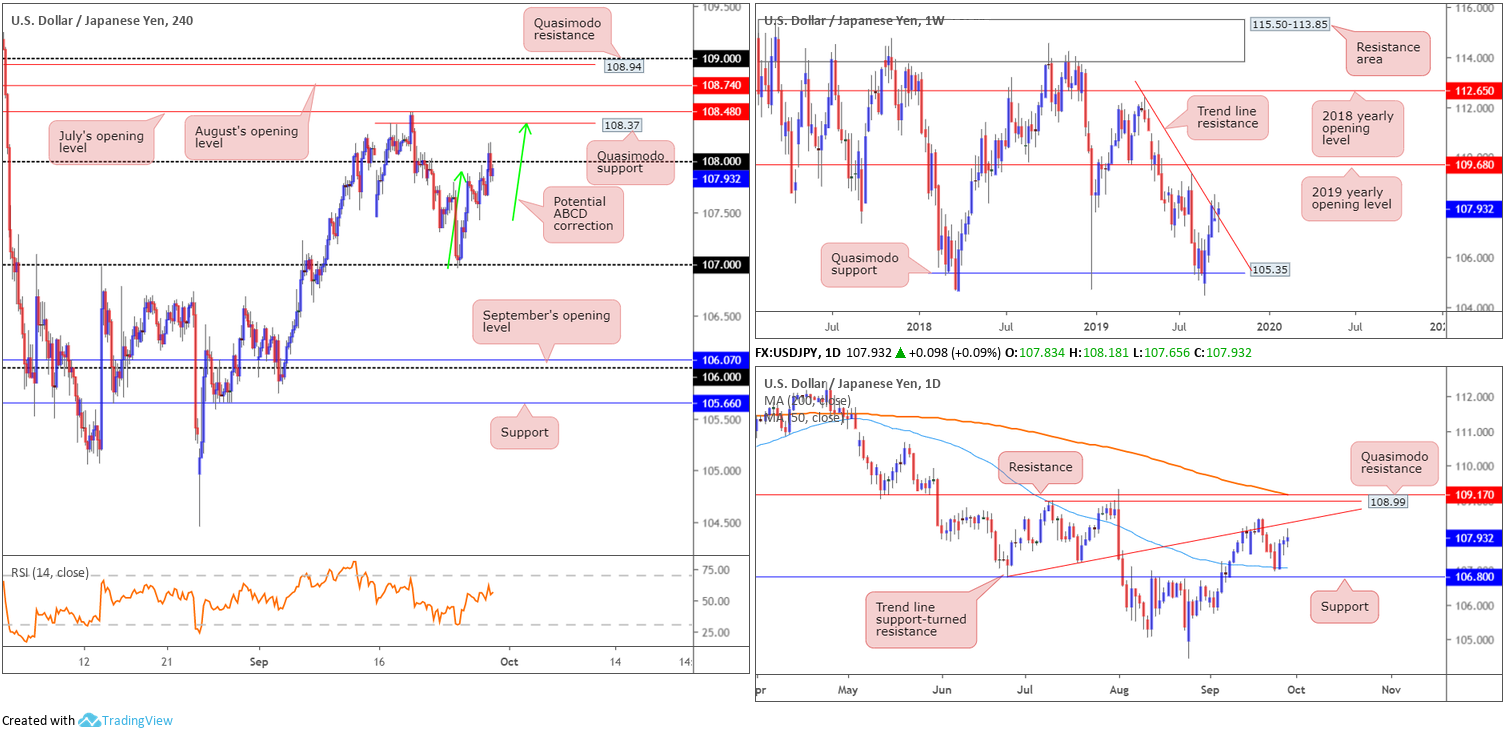 As underscored in Friday’s technical research, entry at 108.37 is an option, with a protective stop-loss order positioned either above July or August’s opening levels at 108.48 and 108.74, respectively, dependent on risk appetite. Downside expectation falls on a break back beneath 108: a cue to think about reducing risk to breakeven and liquidating a portion of the position.